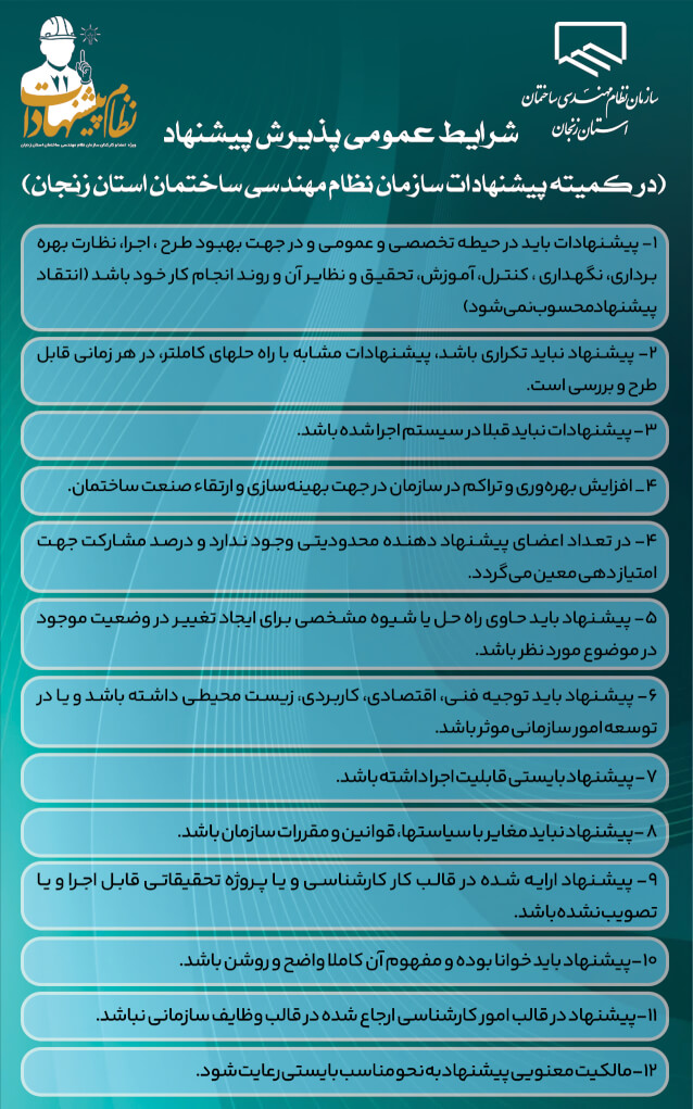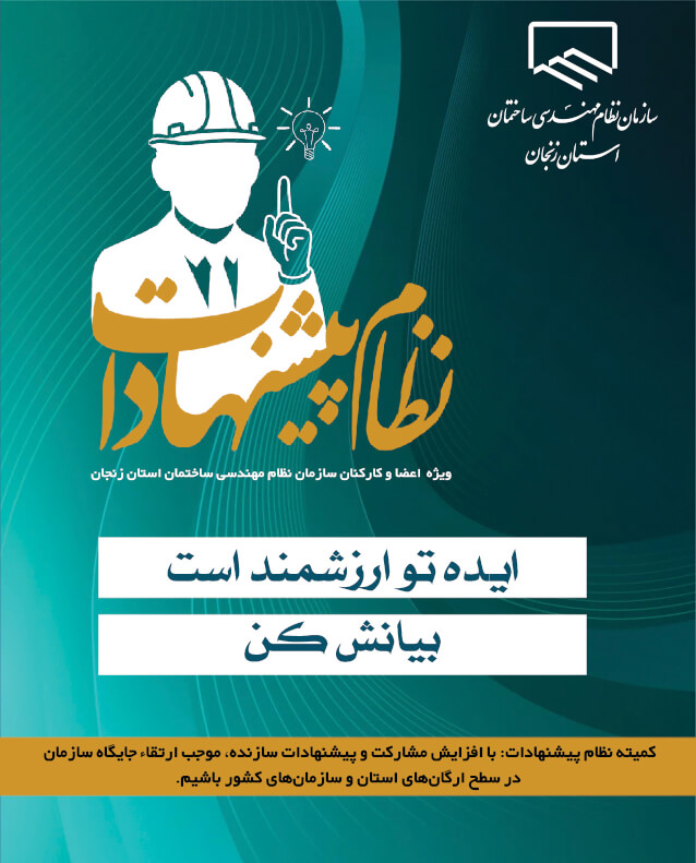 از کلیه اعضای فرهیخته سازمان دعوت می گردد تا با ارائه نظرات، تجارب و برنامه های پیشنهادی خود در حوزه های طراحی، محاسبه، اجرا، بهره برداری، نگهداری و سایر فعالیت های مهندسی و همچنین ارائه راهکارهای اجرایی به جهت ایجاد زمینه های مناسب شغلی، فرهنگی، اقتصادی و رفاهی در راستای انتقال این نظرات و پیشنهادات و تجارب به گروه ها و کمیسیون های تخصصی و هچنین حوزه مدیریت و برنامه ریزی سازمان استان، مجموعه مدیریتی سازمان را در جهت نیل به اهداف عالی سازمان و اعتلای هرچه بیشتر ارائه خدمات مهندسی، یاری دهند.