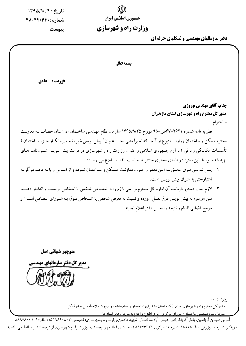 عدم اعتبار نسخه منتشر شده در فضای مجازی با عنوان پیشنویس شیوه نامه پیمانکار جزء ساختمان (تاسیسات مکانیکی و برقی)