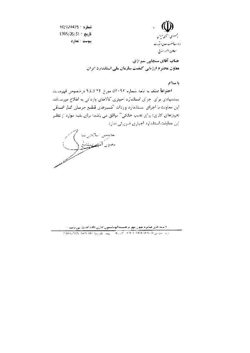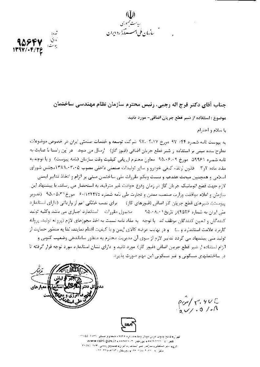 نامه شورای مرکزی مبنی بر الزام و اتخاذ تدابیر ایمنی لازم در استفاده از شیر قطع کن جریان اضافی گاز