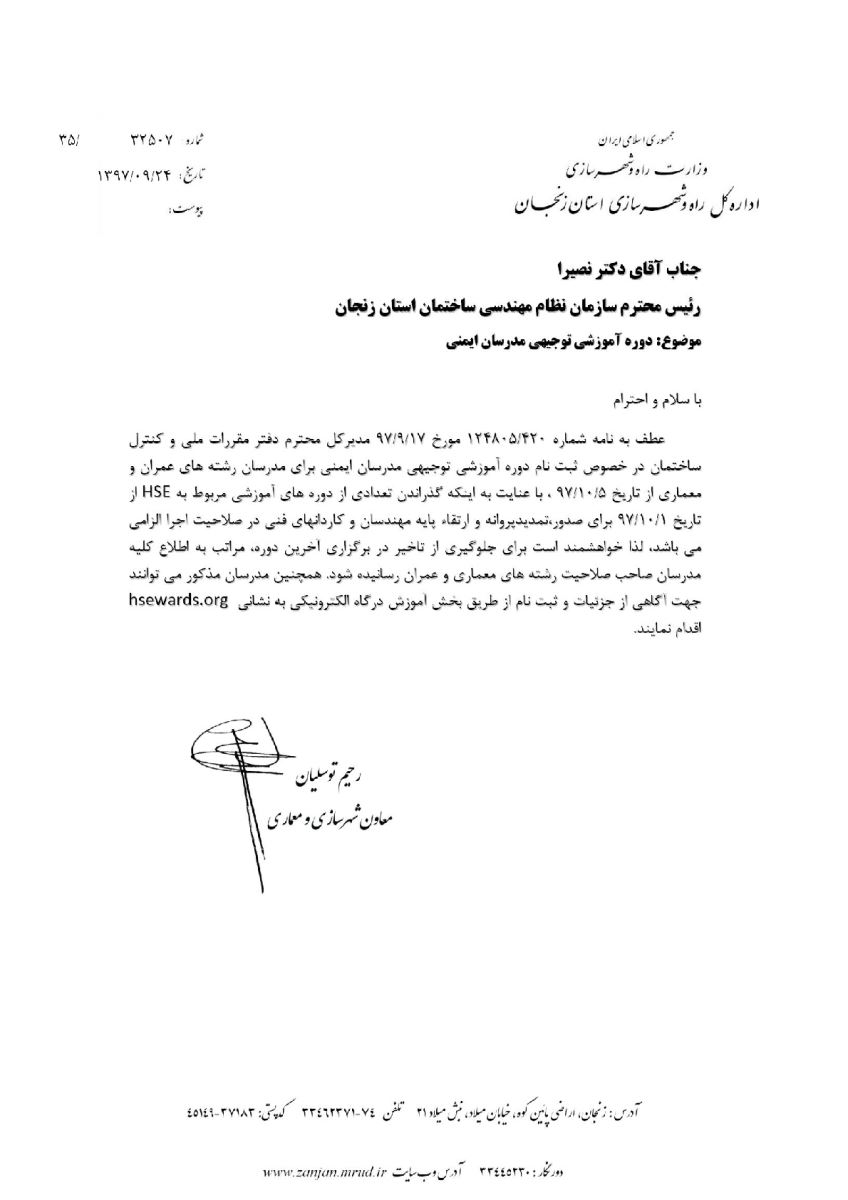 نامه معاونت شهرسازی و معماری اداره کل راه و شهرسازی استان در خصوص دوره آموزشی توجیهی مدرسان ایمنی