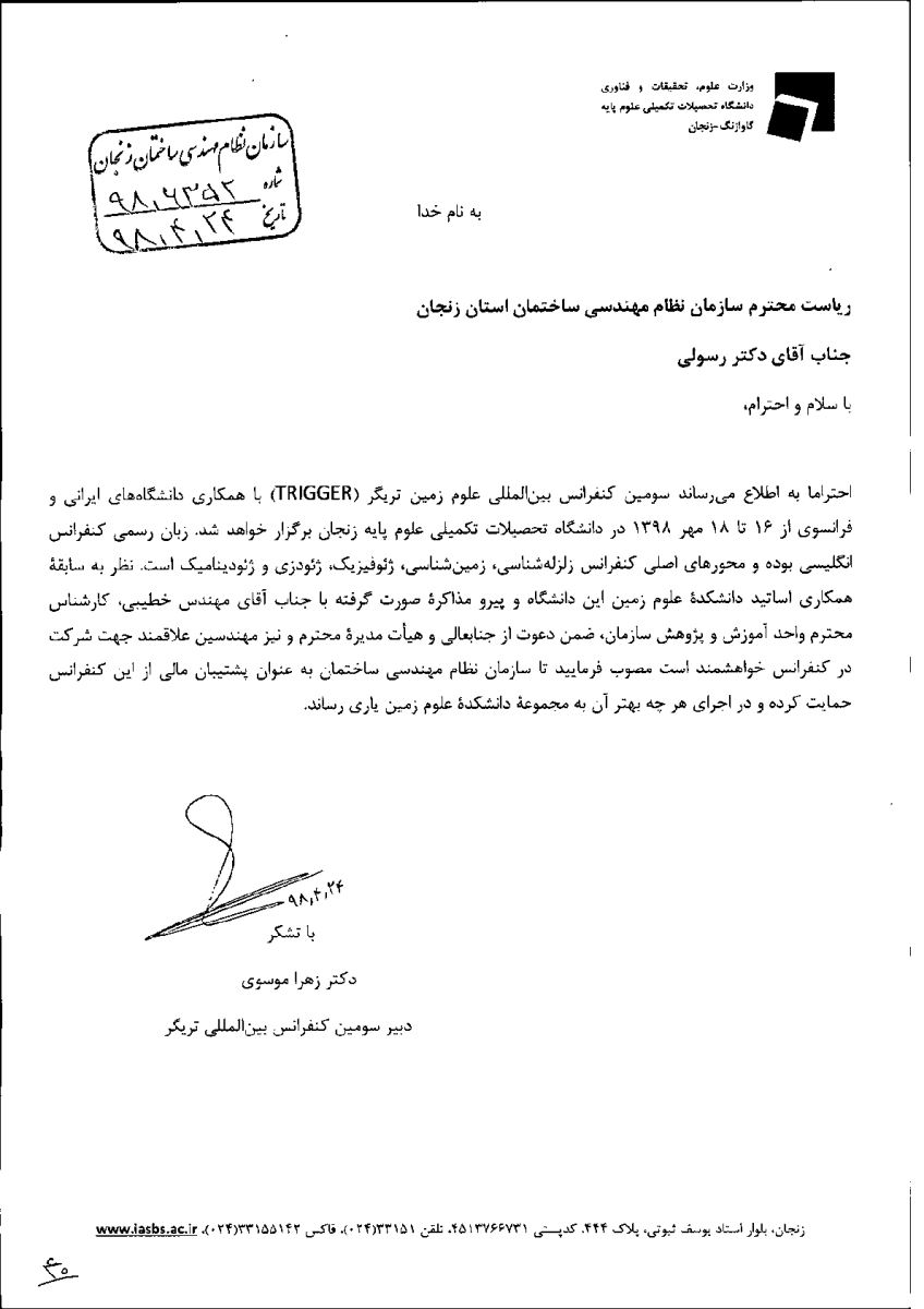 برگزاری سومین کنفرانس بین المللی علوم زمین تریگر(TRIGGER ) در دانشگاه تحصیلات تکمیلی علوم پایه زنجان