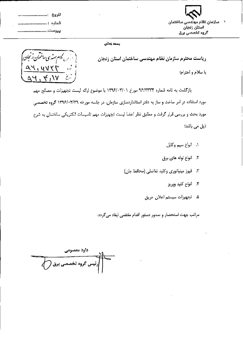 درخواست اعلام نام و برند مصالح استاندارد استفاده شده در ساخت و سازها توسط ناظران طبق فرم مربوطه