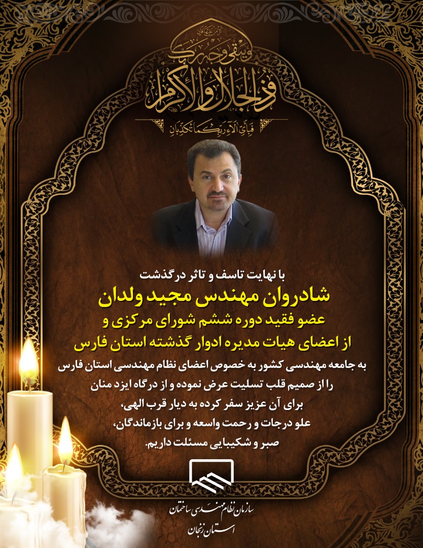 پیام تسلیت هیئت مدیره سازمان نظام مهندسی ساختمان استان زنجان در پی درگذشت شادروان مهندس مجید ولدان