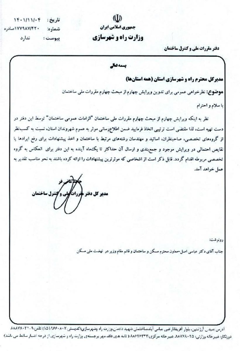 نظرخواهی عمومی تدوین ویرایش چهارم مبحث چهارم مقررات ملی ساختمان (الزامات عمومی ساختمان)