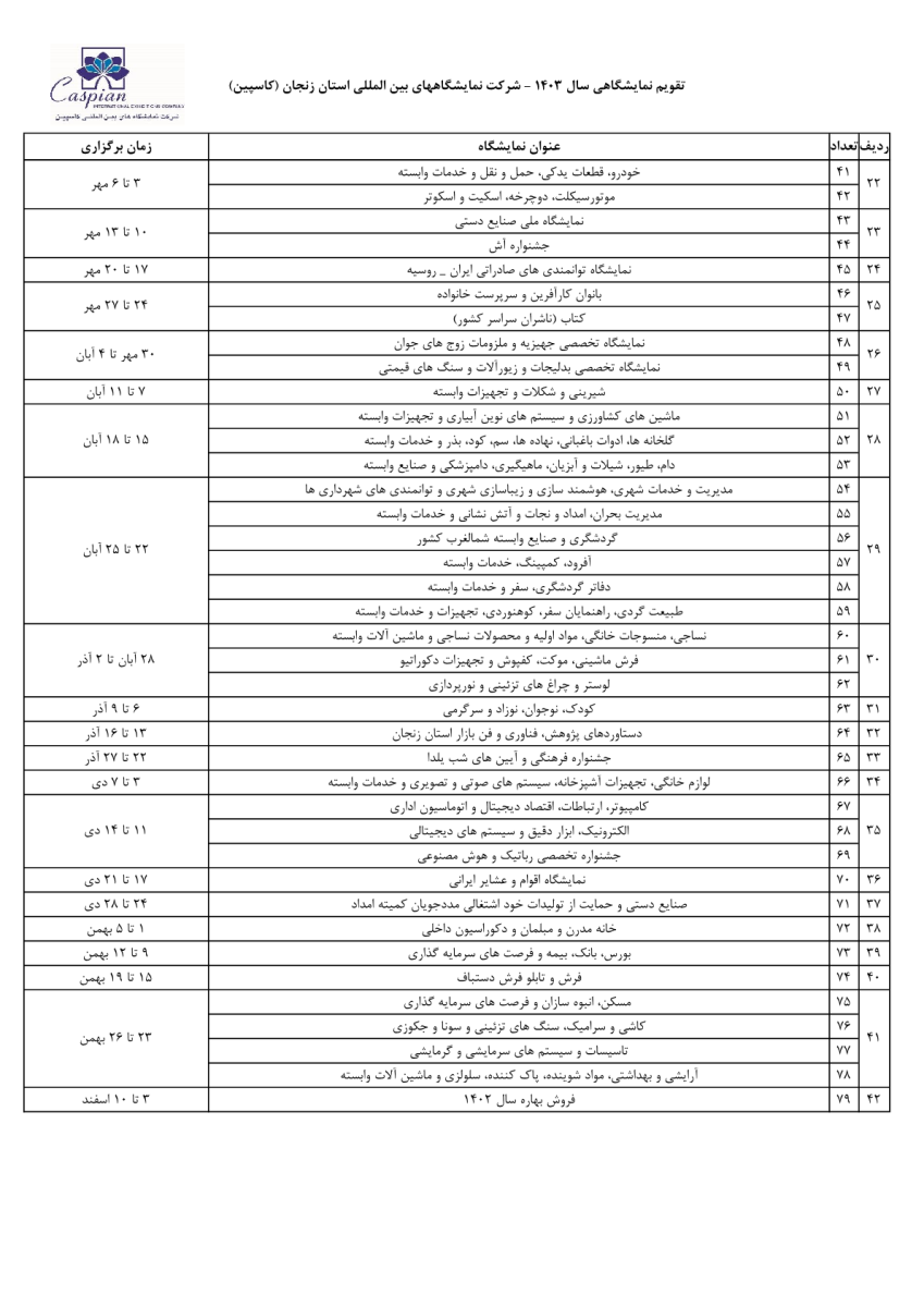 ابلاغ تقویم نمایشگاهی سال ۱۴۰۳ شرکت نمایشگاههای بینالمللی زنجان (کاسپین)