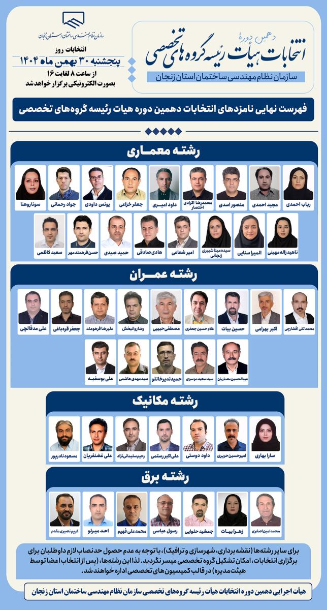 💠فهرست نهایی نامزدهای انتخابات دهمین دوره هیئت رئیسه گروههای تخصصی سازمان نظام مهندسی ساختمان استان زنجان