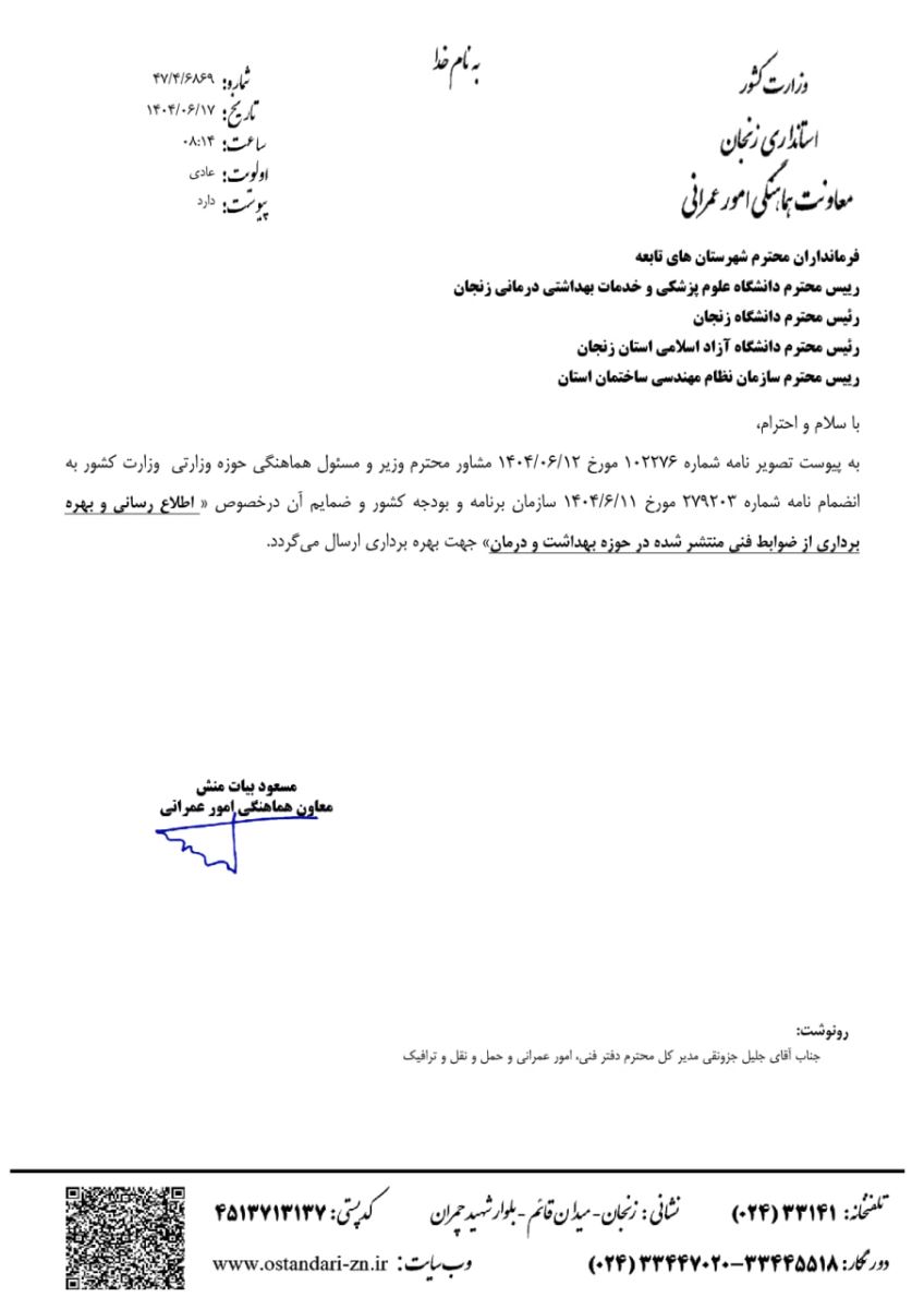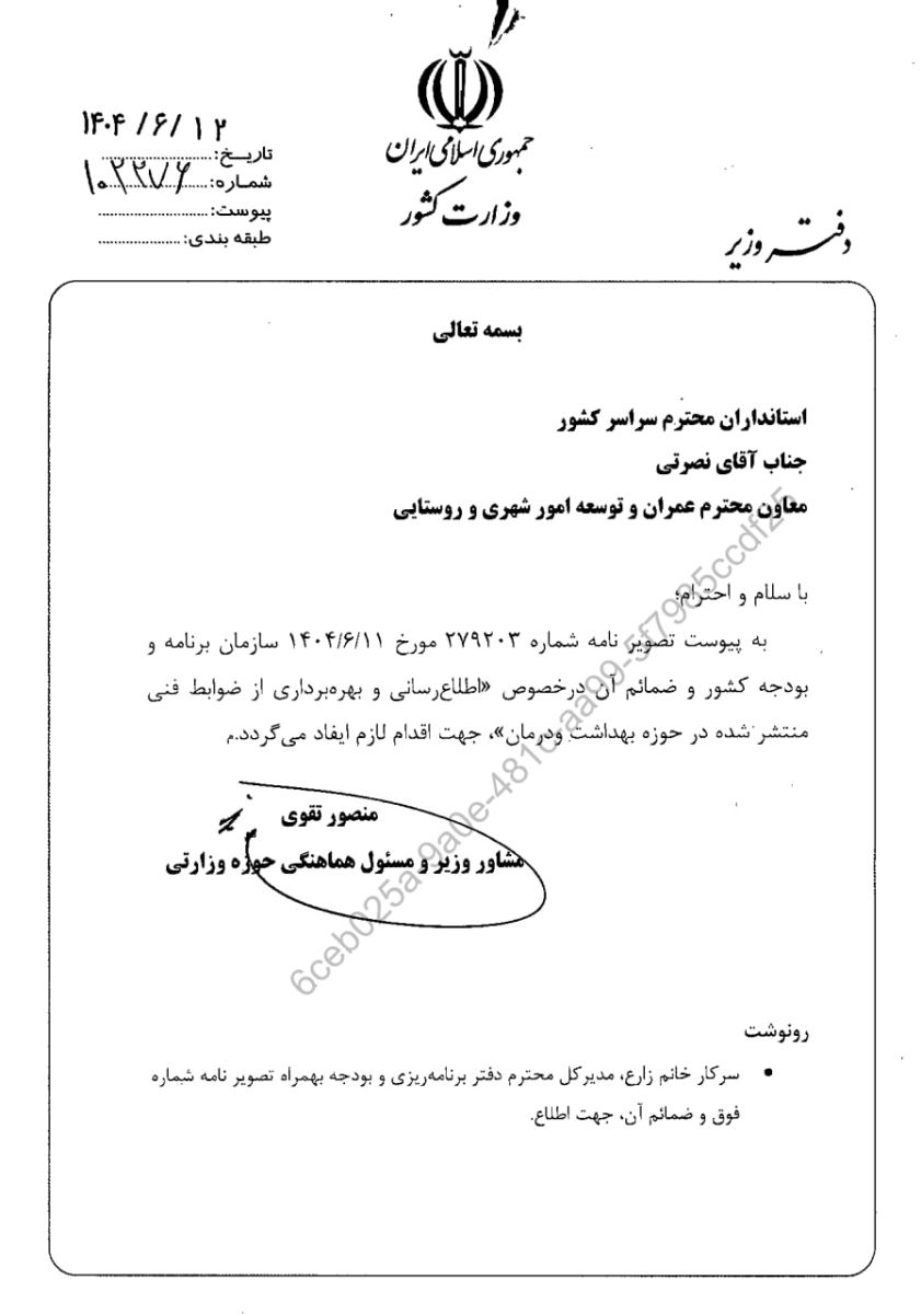 🔰 نامه مشاور وزیر و مسئول هماهنگی حوزه وزارتی وزارت کشور به انضمام نامه سازمان برنامه و بودجه کشور و ضمایم آن در خصوص اطلاع رسانی و بهرهبرداری از ضوابط فنی منتشر شده در حوزه بهداشت و درمان