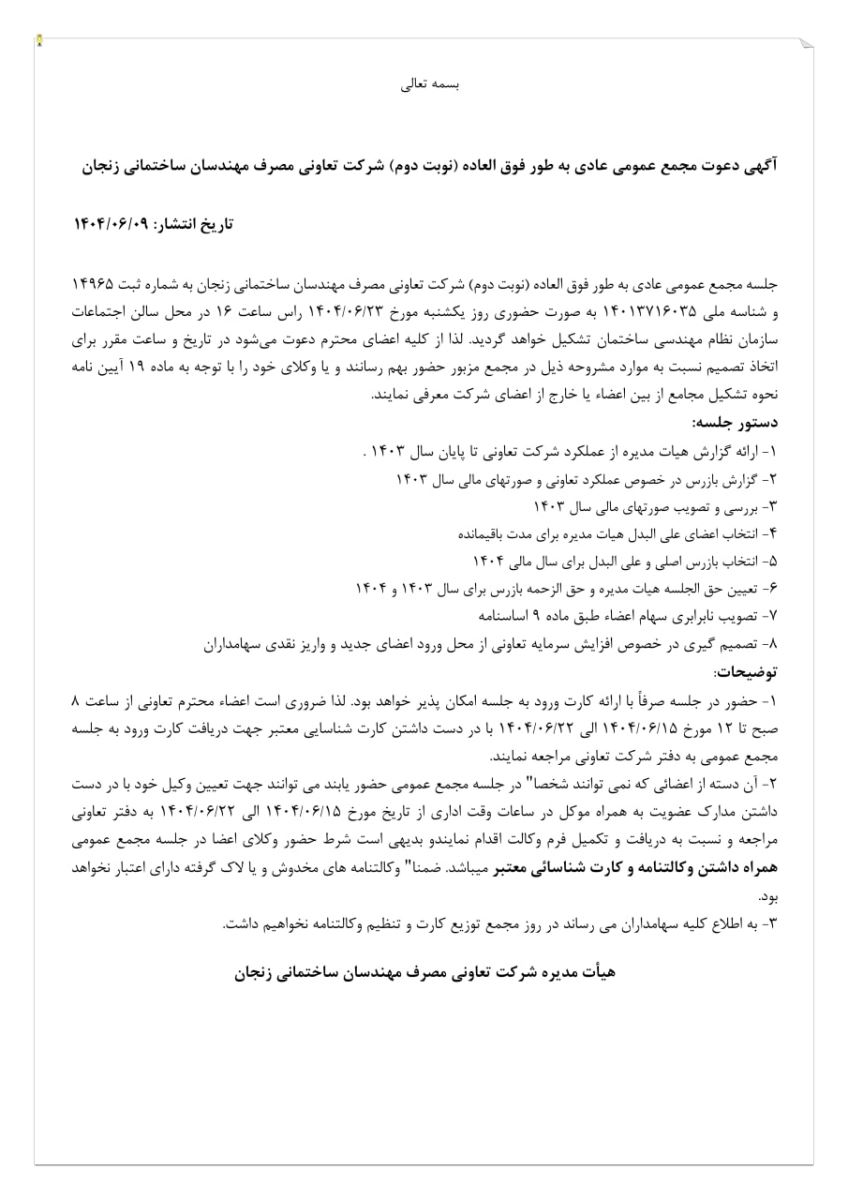آگهی دعوت به مجمع عمومی عادی نوبت دوم شرکت تعاونی مصرف مهندسان ساختمانی زنجان