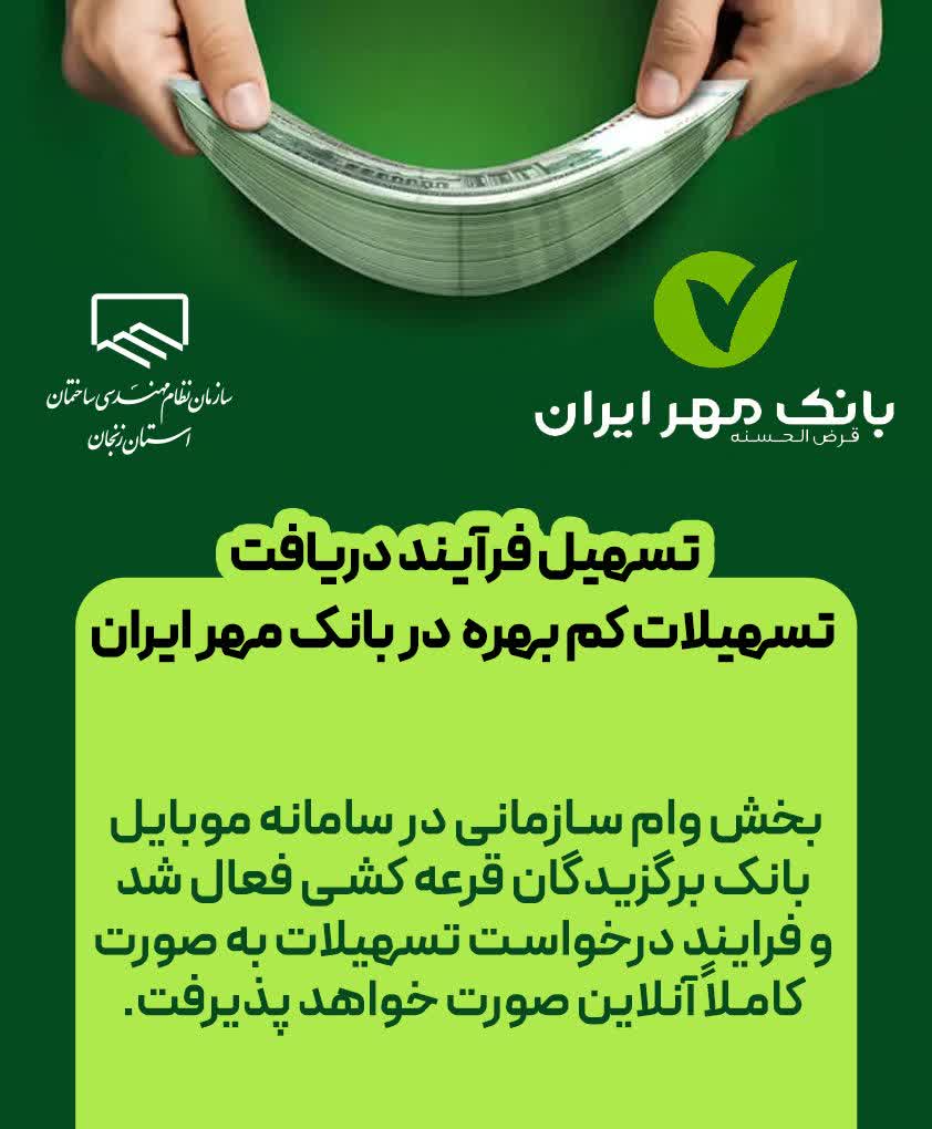 ✳️پیرو معرفی اولین لیست برگزیدگان قرعه‌کشی ماهانه دریافت تسهیلات کم‌بهره به بانک مهر ایران، امور رفاهی سازمان با هماهنگی‌های به عمل آمده با این بانک، در راستای جلوگیری از اتلاف وقت و مراجعات غیرضروری مهندسان گرامی به توافق مطلوبی دست یافته است.