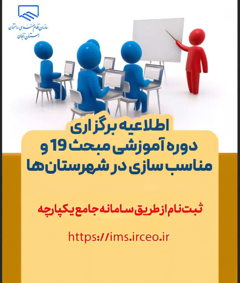 🔻قابل توجه اعضای محترم سازمان در شهرستانهای ابهر، خرمدره و خدابنده: ⭕️اطلاعیه برگزاری دوره آموزشی مبحث ۱۹ و مناسب سازی در شهرستانها