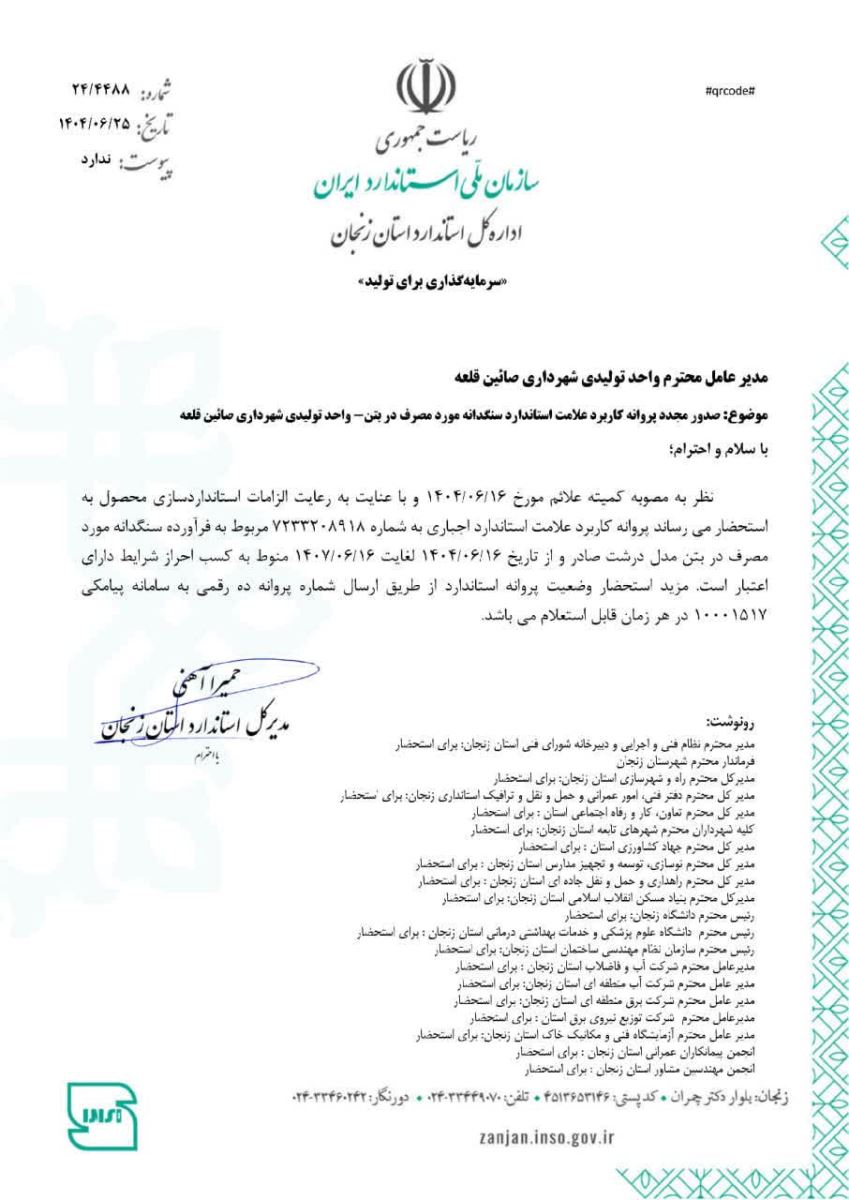 🛡 صدور مجدد پروانه کاربرد علامت استاندارد سنگدانه مورد مصرف در بتن _ واحد تولیدی  شهرداری صائین قلعه