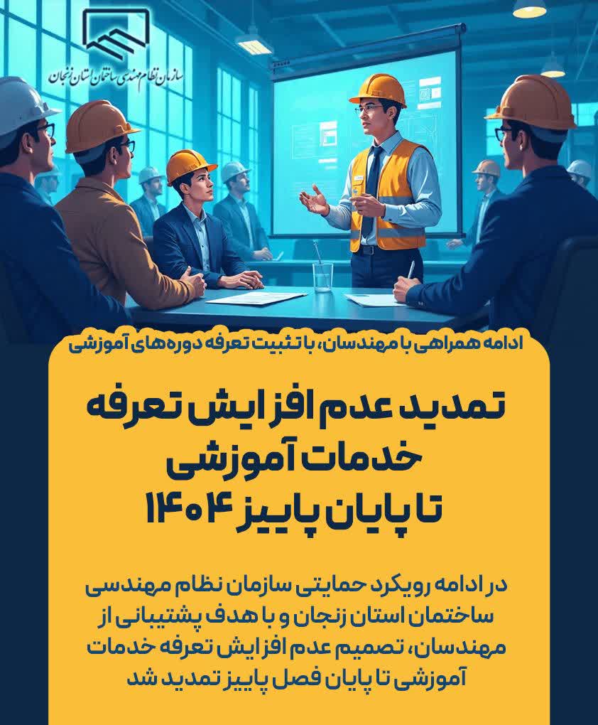 ☀️در ادامه رویکرد حمایتی سازمان نظام مهندسی ساختمان استان زنجان و با هدف پشتیبانی از مهندسان، تصمیم عدم افزایش تعرفه خدمات آموزشی تا پایان فصل پاییز تمدید شد؛ اقدامی که نشان از پایبندی سازمان به ارائه خدمات آموزشی و رفاهی با کیفیت و مقرون به صرفه برای اعضا دارد.
