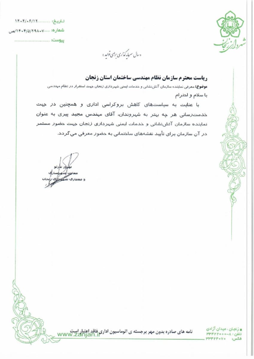 🔶️معرفی نماینده سازمان آتش نشانی و خدماتی ایمنی شهرداری جهت استقرار در محل سازمان 🔸️با عنایت به سیاستهای کاهش بروکراسی اداری و همچنین در جهت خدمت رسانی هرچه بهتر به شهروندان آقای مهندس مجید پیری به عنوان نماینده سازمان آتش نشانی و خدمات ایمنی شهرداری زنجان جهت حضور در محل سازمان نظام مهندسی ساختمان استان زنجان جهت تایید نقشههای ساختمانی معرفی گردید.
