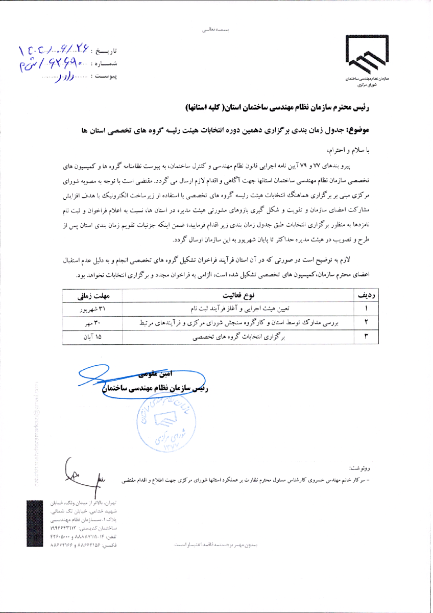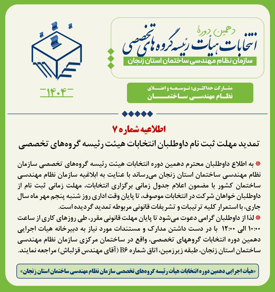🔹️ به اطلاع داوطلبان محترم دهمین دوره انتخابات هیئت رئیسه گروههای تخصصی سازمان نظام مهندسی ساختمان استان زنجان میرساند با عنایت به ابلاغیه سازمان نظام مهندسی ساختمان کشور با مضمون اعلام جدول زمانی برگزاری انتخابات، مهلت زمانی ثبت نام از داوطلبان خواهان شرکت در انتخابات موصوف، تا پایان وقت اداری روز شنبه پنجم مهر ماه سال جاری، با استمرار کلیه ترتیبات و تشریفات قانونی مربوطه تمدید گردیده است.