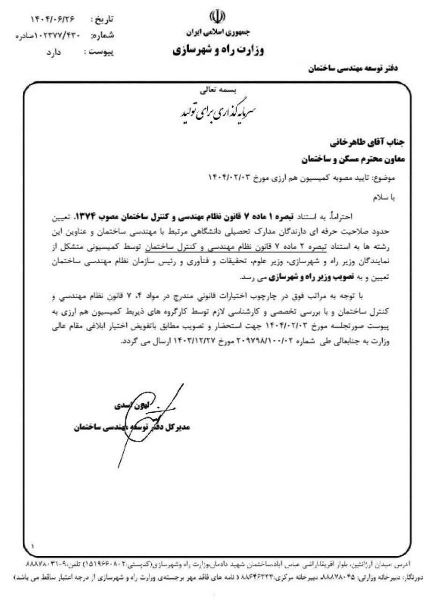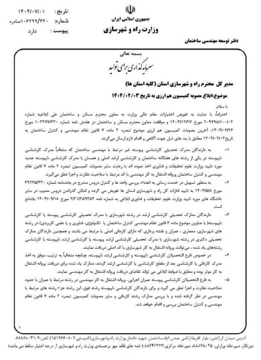 🔹️مدیرکل دفتر توسعه مهندسی ساختمان وزارت راه و شهرسازی مصوبات مورخ ۱۴۰۴/۰۷/۰۱ کمیسیون هم ارزی رشتهها (موضوع تبصره ۲ ماده ۷ قانون نظام مهندسی و کنترل ساختمان) را ابلاغ کرد.