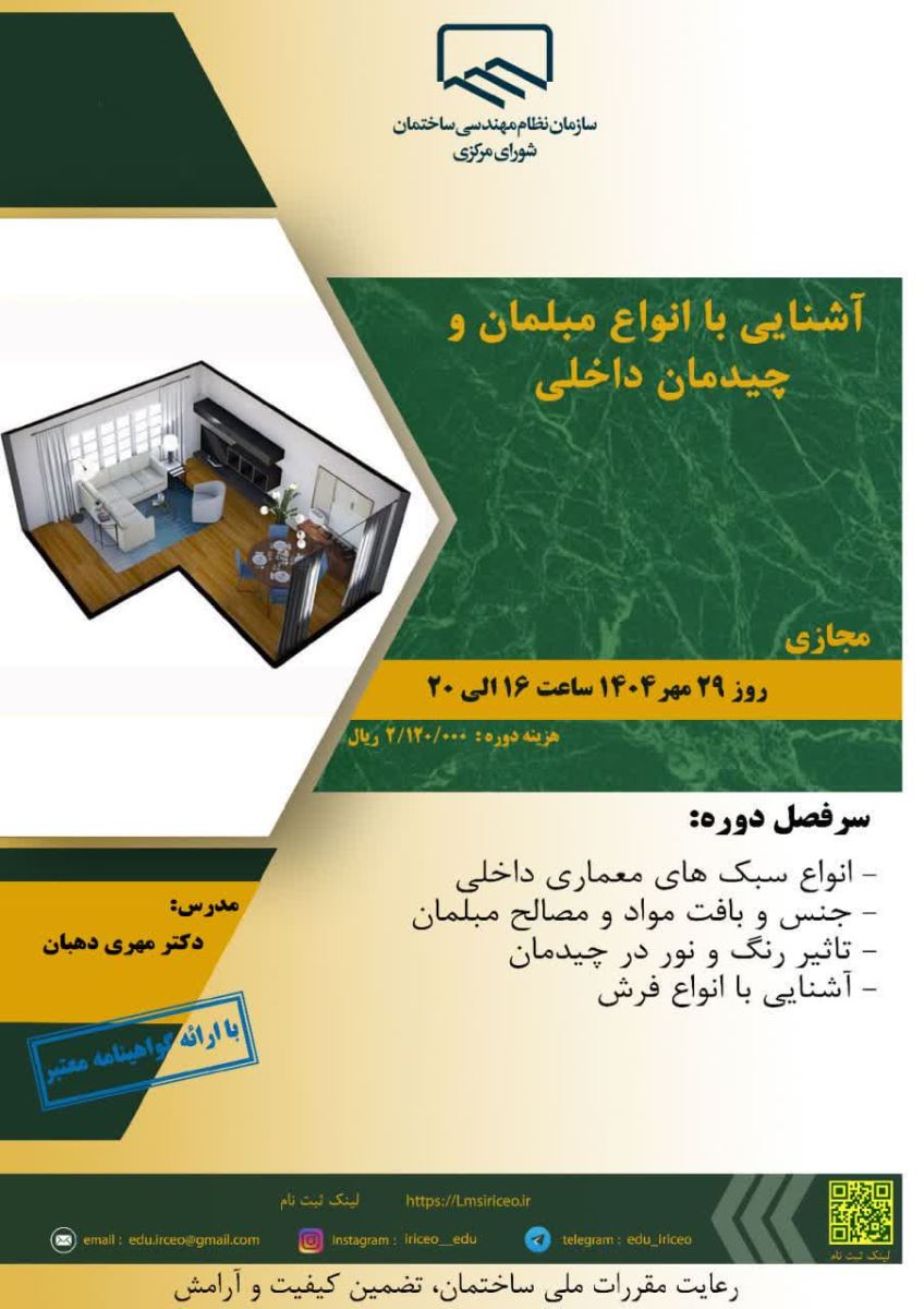 ⚜️قابل توجه اعضای محترم سازمان ☀️دوره آموزشی " آشنایی با انواع مبلمان و چیدمان داخلی " 🔆زمان برگزاری: روز ۲۹ مهر سال ۱۴۰۴ از ساعت ۱۶:۰۰ الی ۲۰:۰۰ 🔅مکان برگزاری: به صورت مجازی