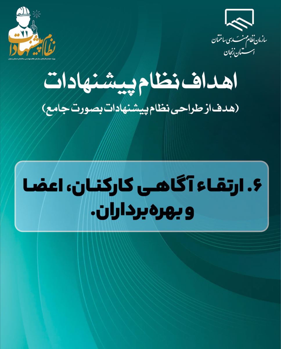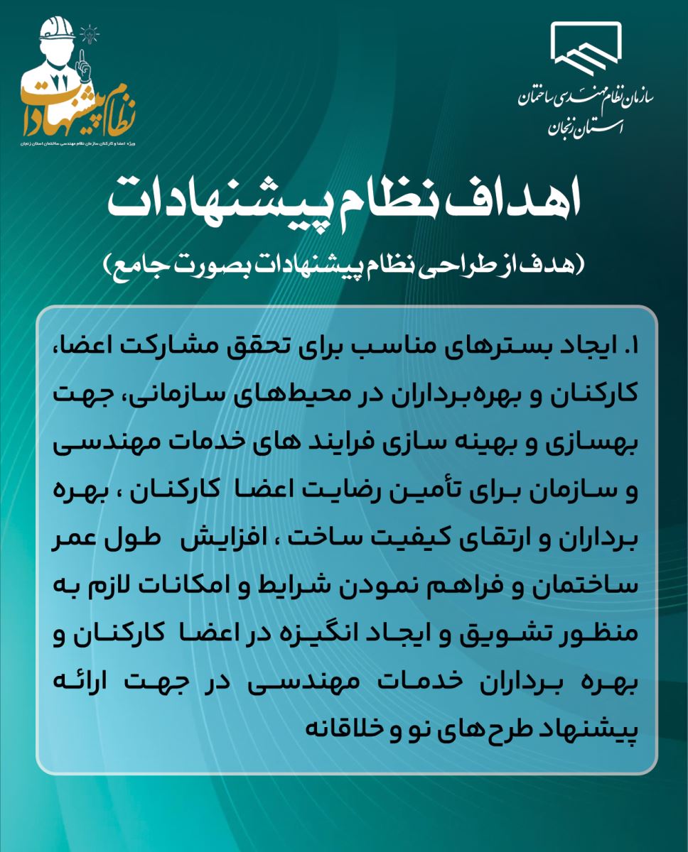 🔹️ ۱. ایجاد بسترهای مناسب برای تحقق مشارکت اعضا، کارکنان و بهرهبرداران در محیطهای سازمانی، جهت بهسازی و بهینه سازی فرایند های خدمات مهندسی و سازمان برای تأمین رضایت اعضا کارکنان ، بهرهبرداران و ارتقای کیفیت ساخت ، افزایش طول عمر ساختمان و فراهم نمودن شرایط و امکانات لازم به منظور تشویق و ایجاد انگیزه در اعضا کارکنان و بهره برداران خدمات مهندسی در جهت ارائه پیشنهاد طرحهای نو و خلاقانه