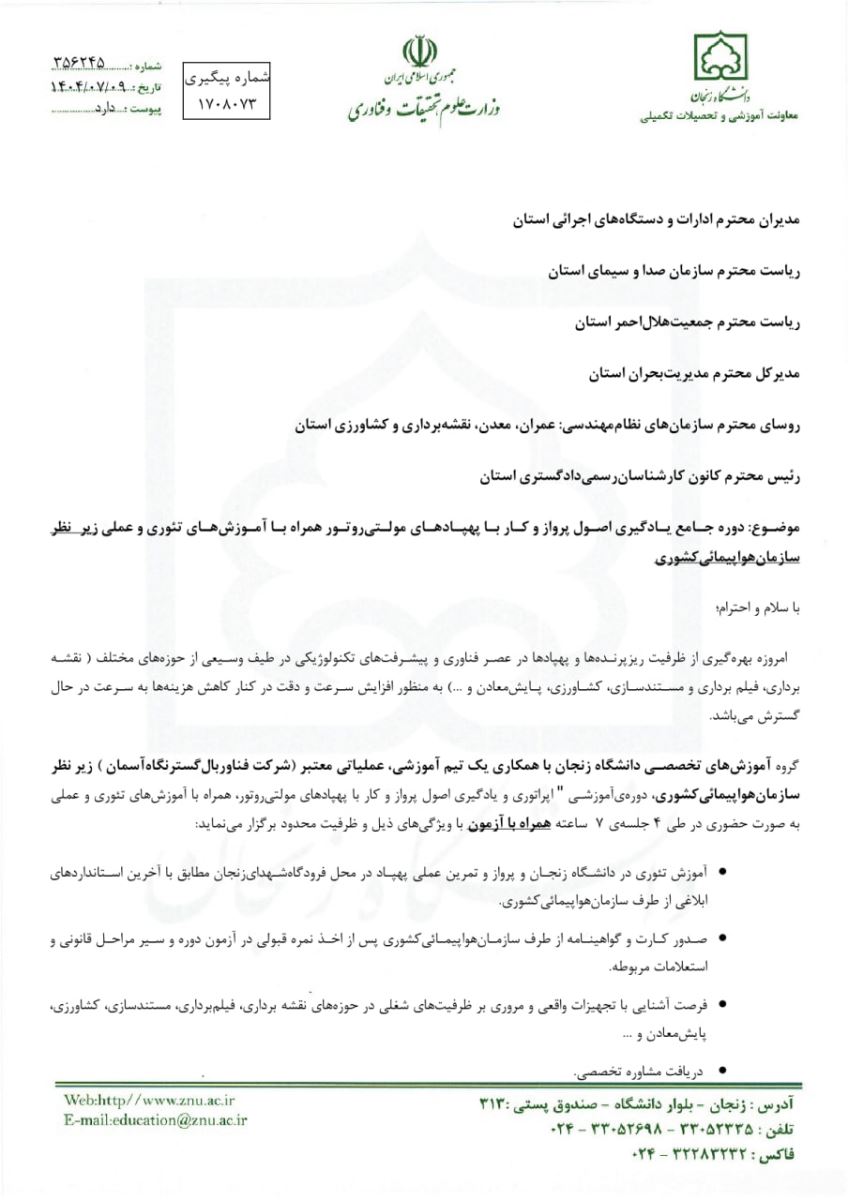 🔰 مرکز آموزشهای آزاد و تخصصی دانشگاه زنجان با همکاری شرکت نگاه آسمان زیر نظر سازمان هواپیمایی کشوری برگزار میکند: