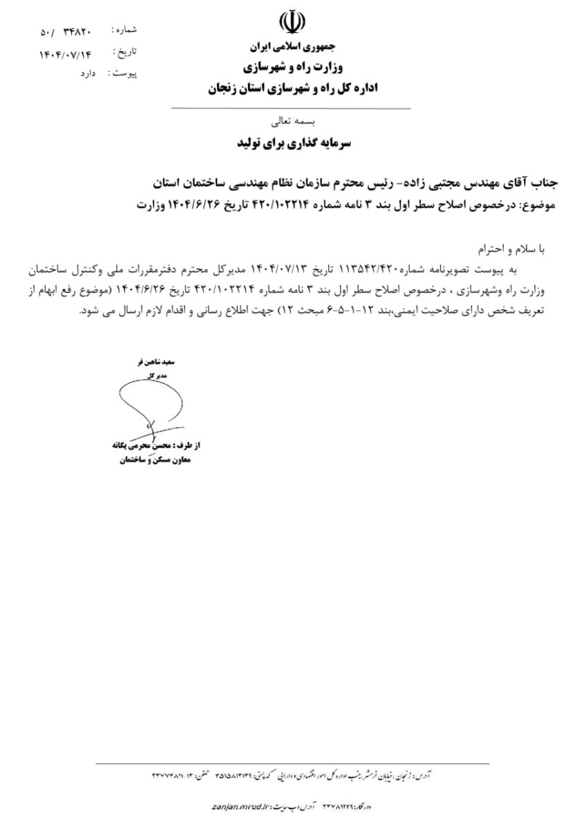 اصلاح سطر اول بند 3 نامه شماره 420/102214 وزارت در خصوص مبحث 12 مقررات ملی ساختمان