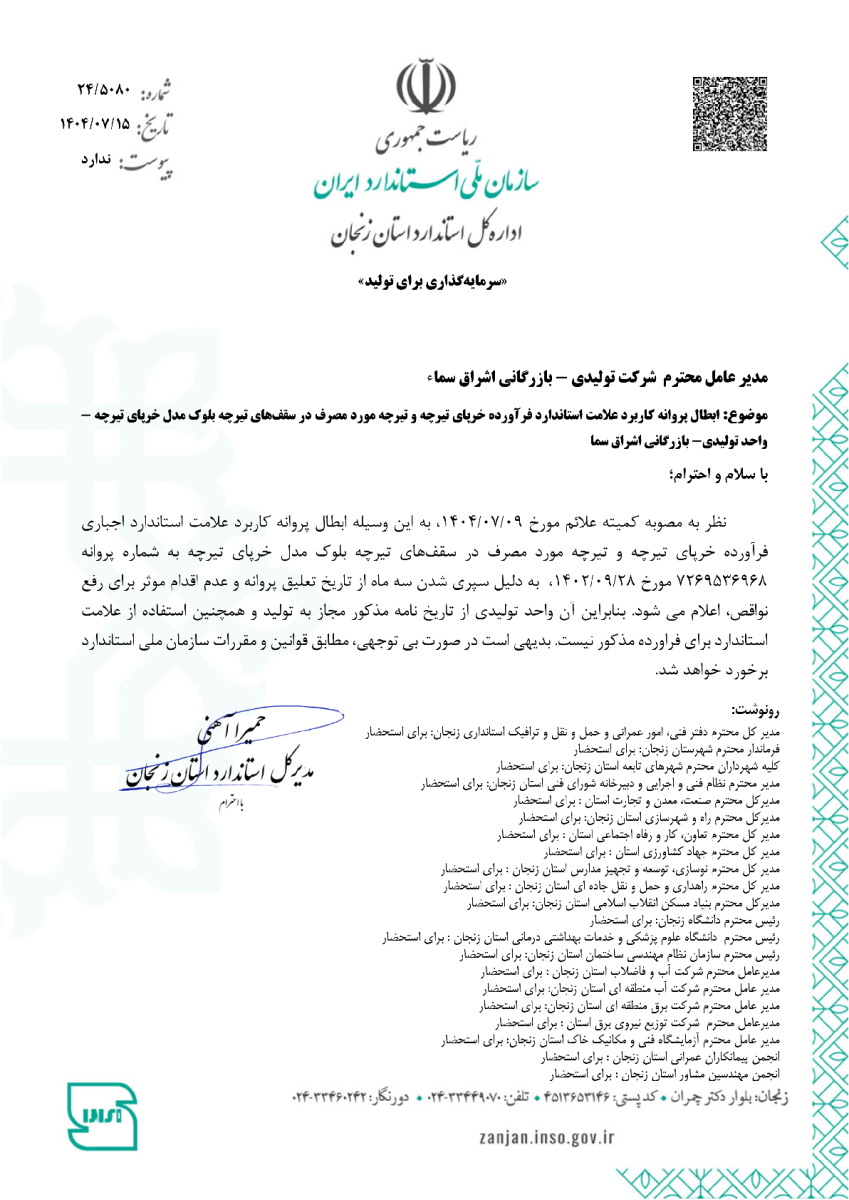 🛡 ابطال پروانه کاربرد علامت استاندارد فرآورده خرپای تیرچه و تیرچه مورد مصرف در سقفهای تیرچه بلوک مدل خرپای تیرچه - واحد تولیدی بازرگانی اشراق سما