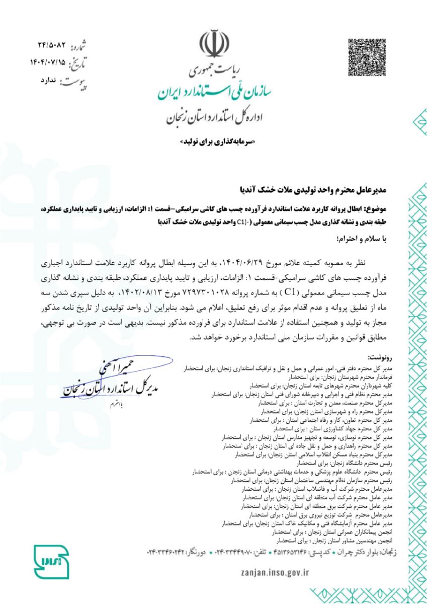 ابطال پروانه کاربرد علامت استاندارد فرآورده چسب کاشی سرامیکی _ واحد تولیدی ملات خشک آندیا