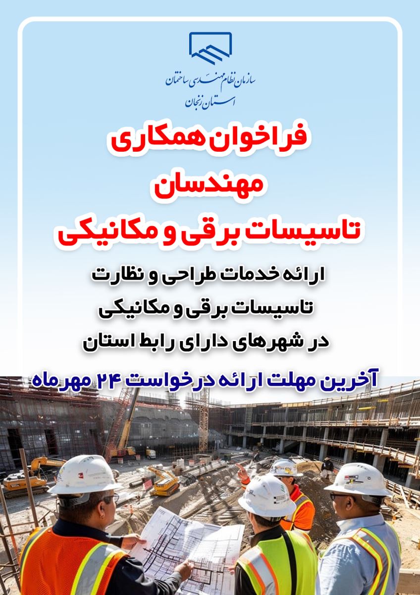 فراخوان همکاری مهندسان طراح و ناظر تاسیسات برقی و مکانیکی