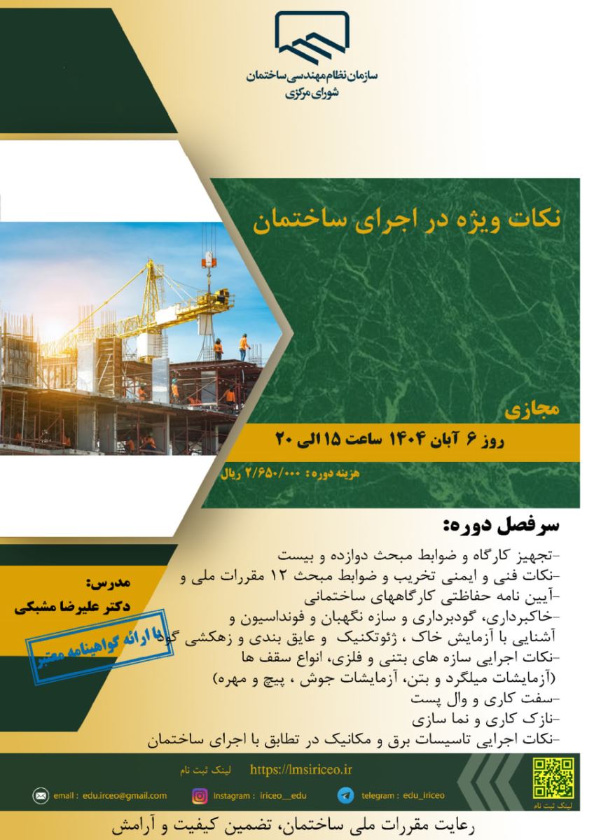⚜️قابل توجه اعضای محترم سازمان ☀️دوره آموزشی " نکات ویژه در اجرای ساختمان " 🔆زمان برگزاری: روز ۶ آبان سال ۱۴۰۴ از ساعت ۱۵:۰۰ الی ۲۰:۰۰ 🔅مکان برگزاری: به صورت مجازی