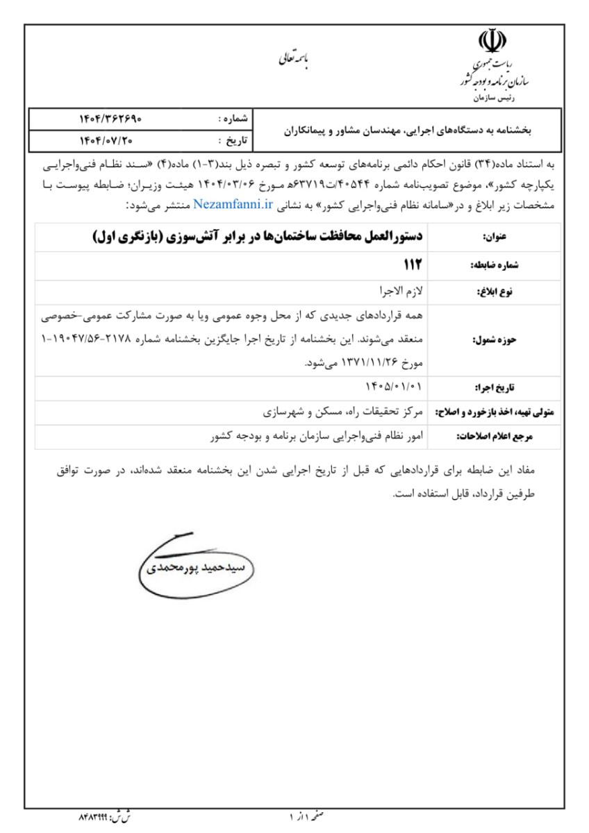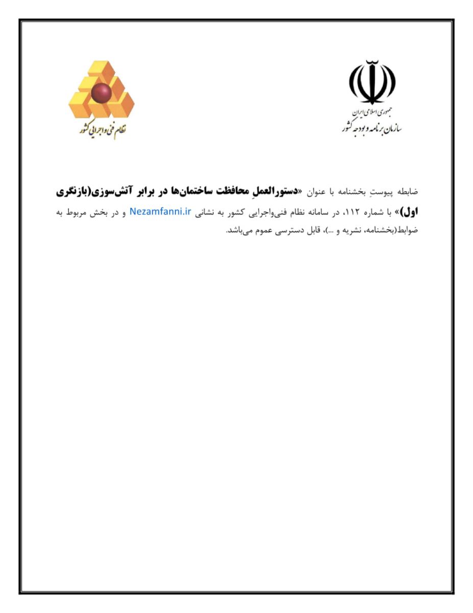 ⬅️ضابطه پیوست بخشنامه به عنوان "دستورالعمل محافظت ساختمانها در برابر آتش سوزی (بازنگری اول)" با شماره ۱۱۲ در سامانه نظام فنی و اجرایی کشور به نشانی www.Nezamfanni.ir و در بخش مربوط به ضوابط (بخشنامه، نشریه و ...)قابل دسترسی عموم میباشد.