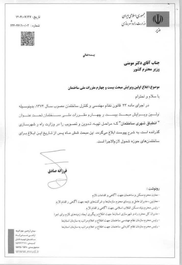 ✳️اولین ویرایش مبحث بیستوچهارم مقررات ملی ساختمان با عنوان «انطباق شهری ساختمان» از سوی وزیر راه و شهرسازی ابلاغ شد.