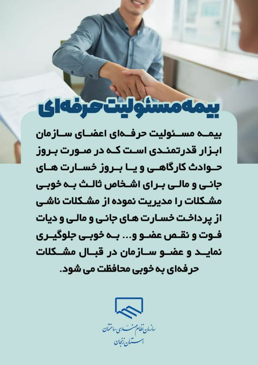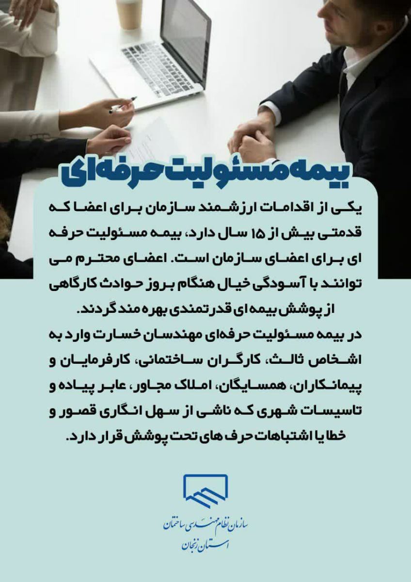 ♻️اعضای محترم سازمان نظام مهندسی ساختمان استان زنجان کامل ترین پوشش بیمه ای مسئولیت حرفه ای مهندسی را به صورت گروهی در سطح کشور دارا می باشند