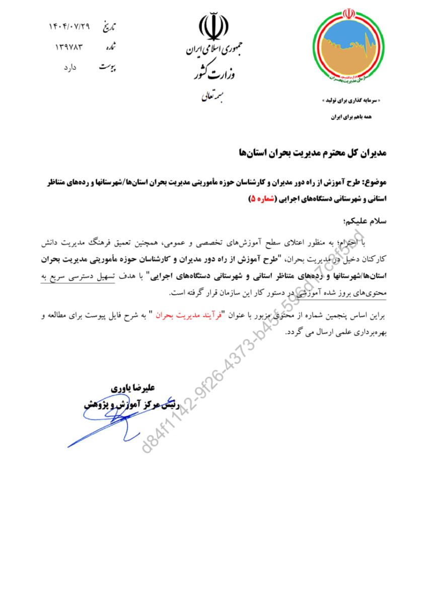 🔰طرح آموزش مدیران و کارشناسان حوزه مأموریتی مدیریت بحران و ردههای متناظر در دستگاههای اجرایی