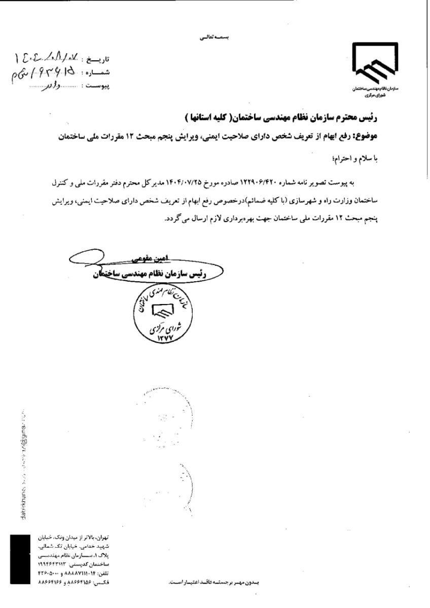 💢رفع ابهام از تعریف شخص داری صلاحیت ایمنی ویرایش پنجم مبحث ۱۲ مقررات ملی ساختمان ♨️نامه مدیر کل محترم دفتر مقررات ملی و کنترل ساختمان وزارت راه و شهرسازی (با کلیه ضمائم) در خصوص رفع ابهام از تعریف شخص دارای صلاحیت ایمنی ویرایش پنجم مبحث ۱۲ مقررات ملی ساختمان