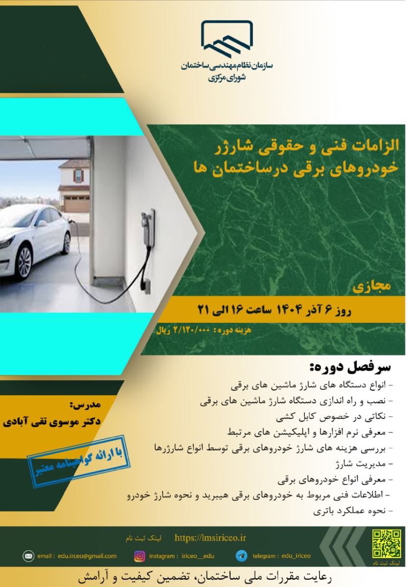 ⚜️قابل توجه اعضای محترم سازمان: ☀️ دوره آموزشی الزامات فنی و حقوقی شارژ خودروهای برقی در ساختمانها 🔆زمان برگزاری: روز ۶ آذرماه ۱۴۰۴ از ساعت ۱۶:۰۰ الی ۲۱:۰۰ 🔅مکان برگزاری: به صورت مجازی