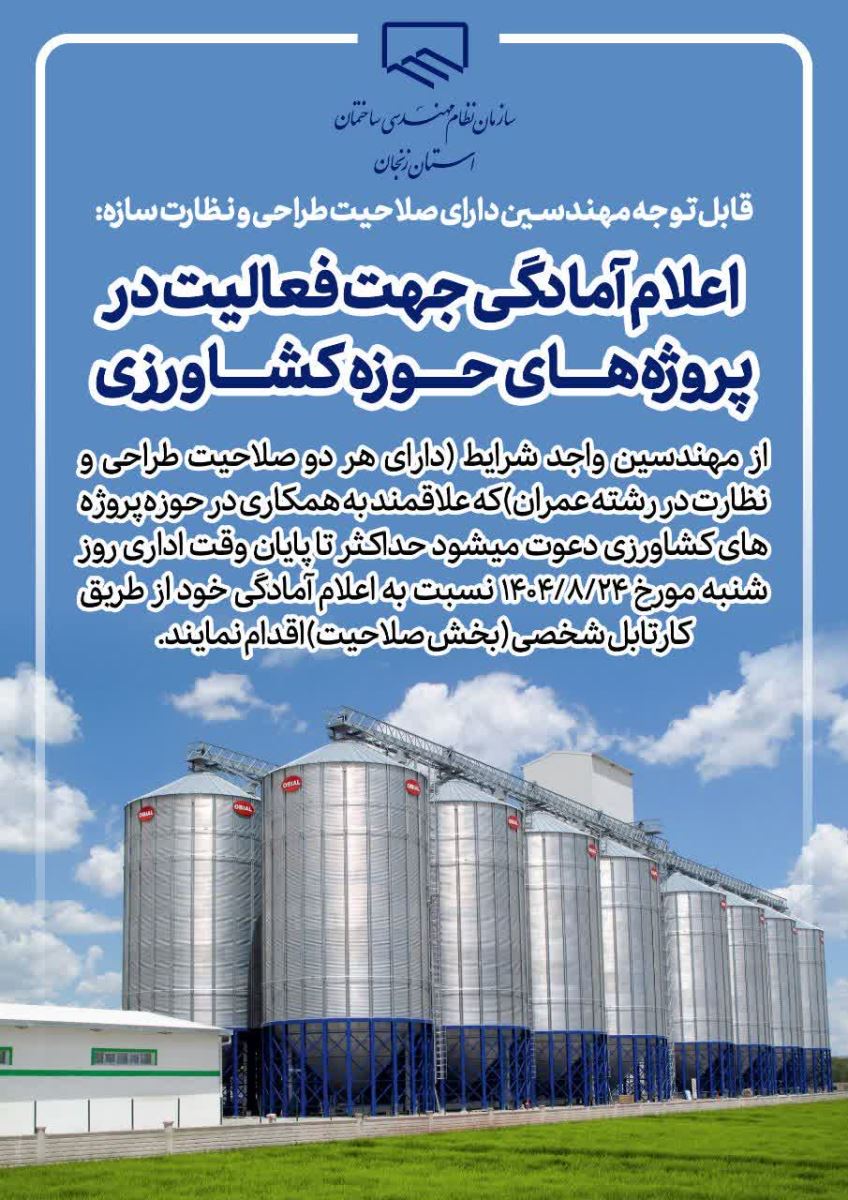 ♦️قابل توجه مهندسین دارای صلاحیت طراحی و نظارت سازه: ⭕️اعلام آمادگی جهت فعالیت در پروژههای حوزه کشاورزی