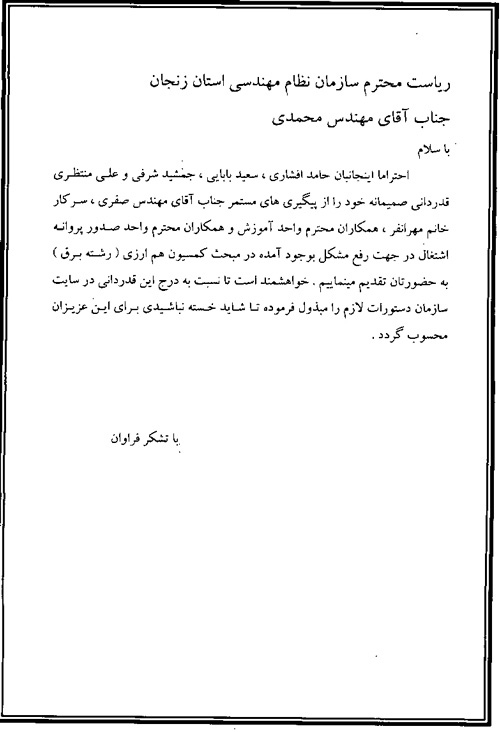 قدردانی از جناب آقای مهندس صفری،سرکارخانم مهرانفر و همکاران واحد آموزش و صدورپروانه اشتغال