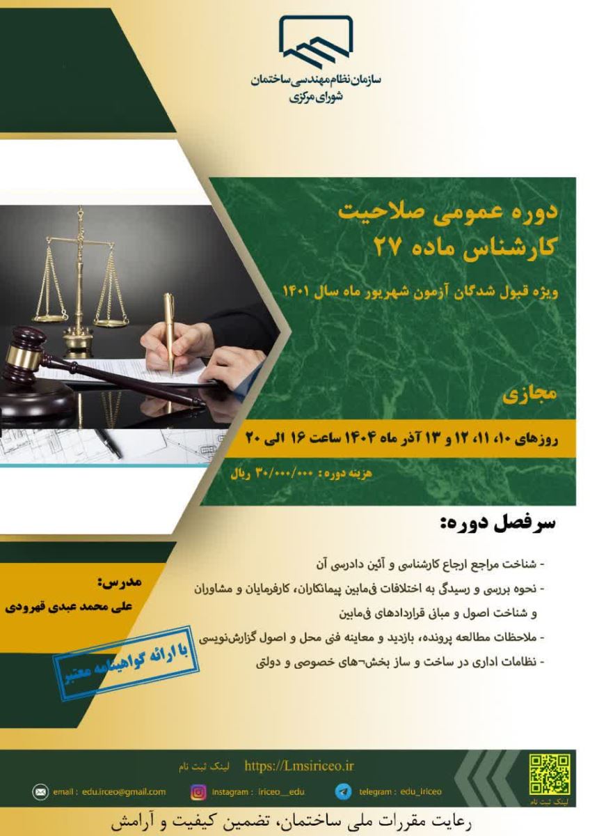 دوره عمومی صلاحیت کارشناس ماده ۲۷ (ویژه قبول شدگان آزمون شهریور ماه سال ۱۴۰۱)