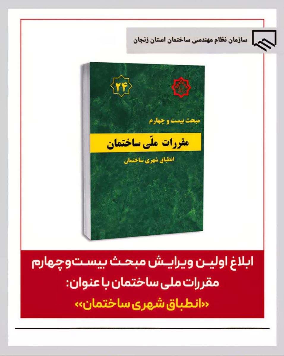 ❇️ابلاغ اولین ویرایش مبحث بیست‌و‌چهارم مقررات ملی ساختمان با عنوان «انطباق شهری ساختمان»