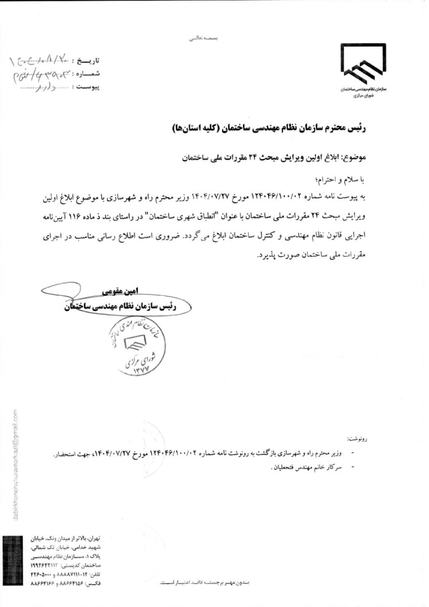 ابلاغ اولین ویرایش مبحث بیست‌و‌چهارم مقررات ملی ساختمان با عنوان «انطباق شهری ساختمان»