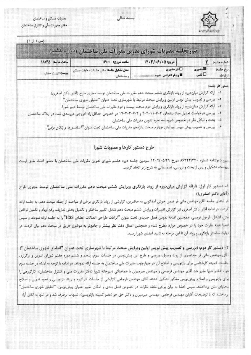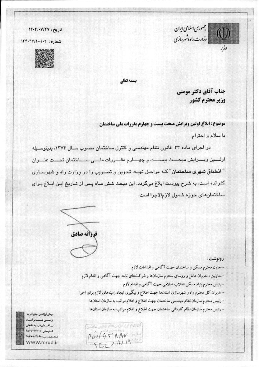 ✳️اولین ویرایش مبحث بیست‌و‌چهارم مقررات ملی ساختمان با عنوان «انطباق شهری ساختمان» از سوی وزیر راه و شهرسازی ابلاغ شد.