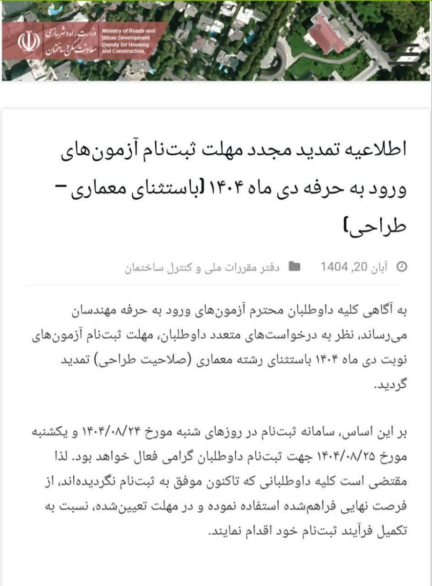 💠اطلاعیه تمدید مجدد مهلت ثبتنام آزمونهای ورود به حرفه دی ماه ۱۴۰۴ (به استثنای معماری – طراحی) 🔷️به آگاهی تمامی داوطلبان محترم آزمونهای ورود به حرفه مهندسان میرساند، نظر به درخواستهای متعدد داوطلبان، مهلت ثبتنام آزمونهای نوبت دی ماه ۱۴۰۴ باستثنای رشته معماری (صلاحیت طراحی) تمدید گردید.