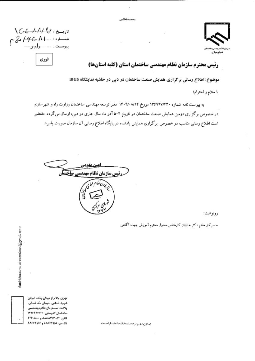 🔹️مکاتبه رییس شورای مرکزی پیرو مکاتبه مدیر کل دفتر توسعه مهندسی ساختمان در خصوص برگزاری نمایشگاه صنعت ساختمان در دبی در حاشیه نمایشگاه BIG5