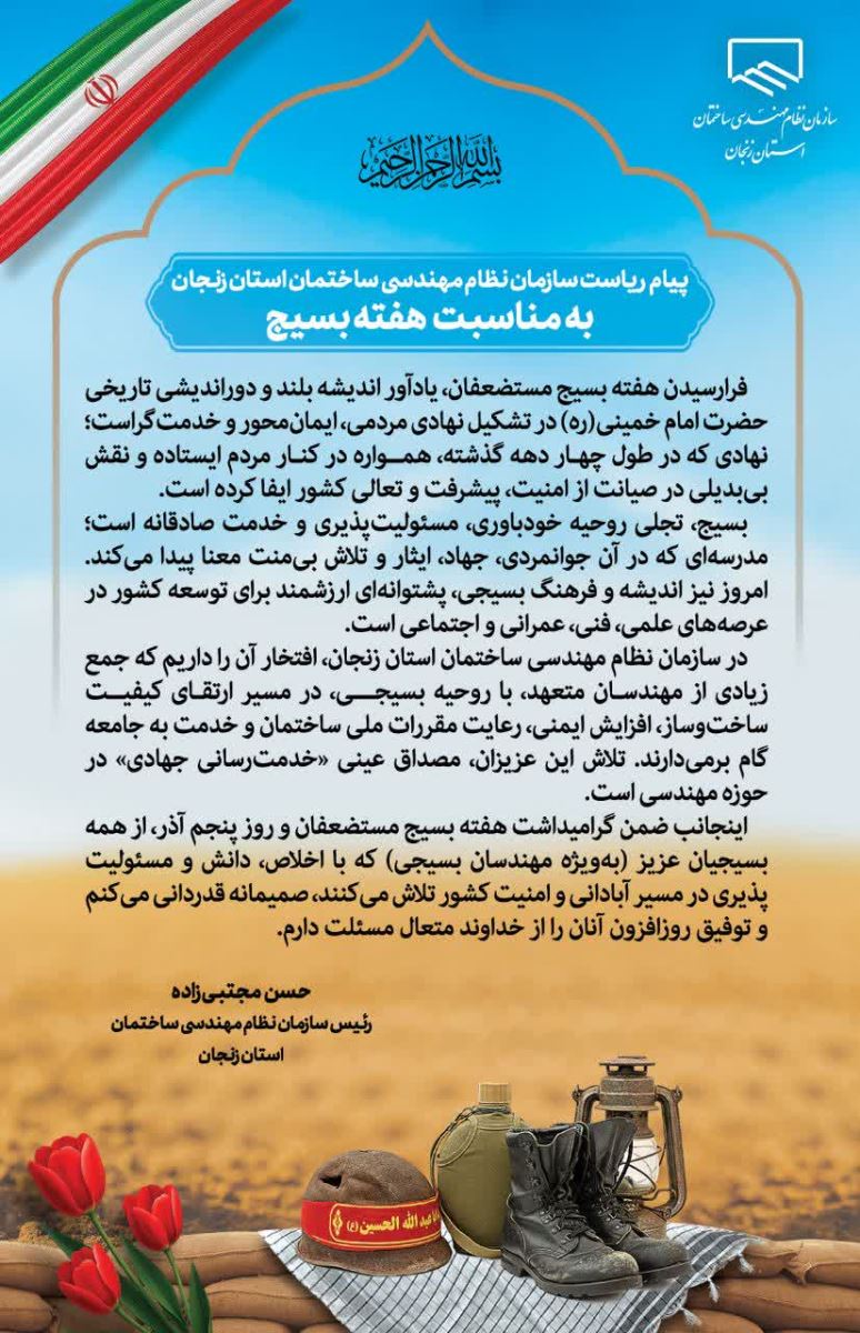 ↕️پیام مهندس حسن مجتبی‌زاده، ریاست سازمان نظام مهندسی ساختمان استان زنجان؛ به مناسبت هفته بسیج مستضعفان