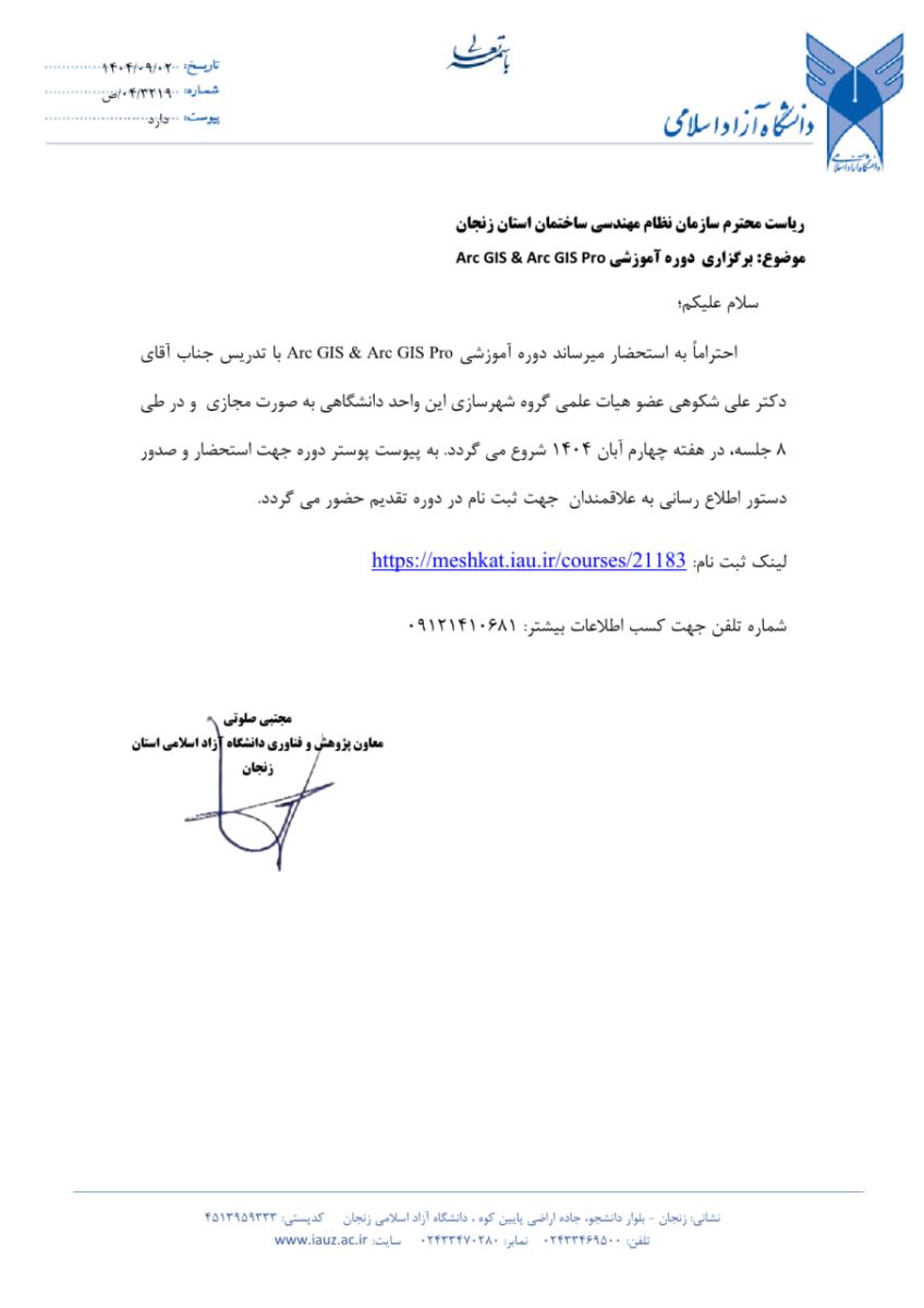 ⬅️برگزاری دوره آموزشی Arc GIS & Arc GIS Pro با تدریس دکتر علی شکوهی عضو هیئت علمی دانشگاه آزاد به صورت مجازی و طی ۸ جلسه در هفته چهارم آبان ماه ۱۴۰۴