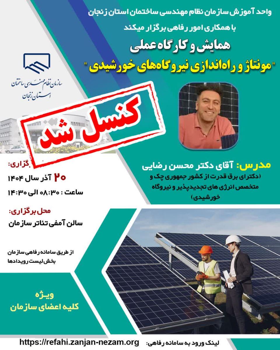 ❇️نظر به شرایط نامساعد جوی و عدم امکان حضور استاد دوره در زنجان همایش و کارگاه عملی کارگاه مونتاژ و راه اندازی نیروگاه خورشیدی لغو گردید