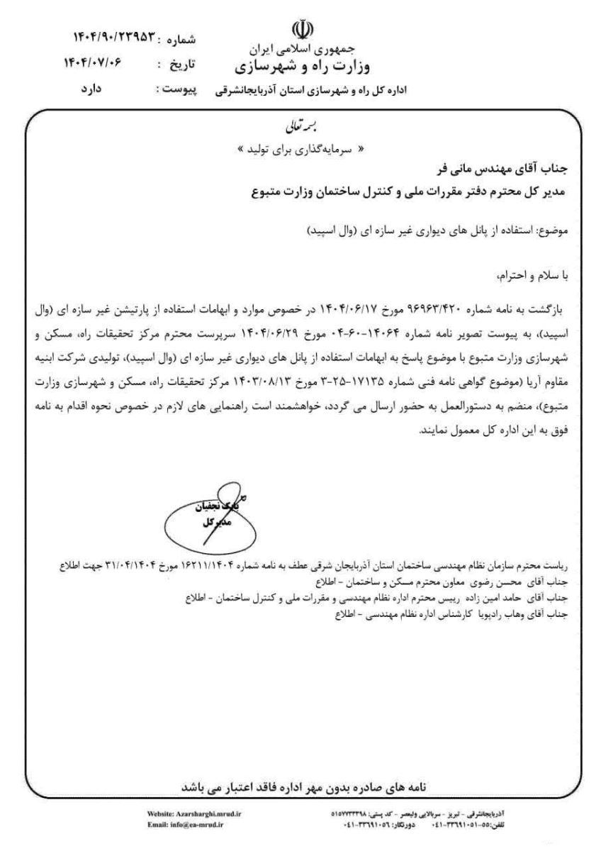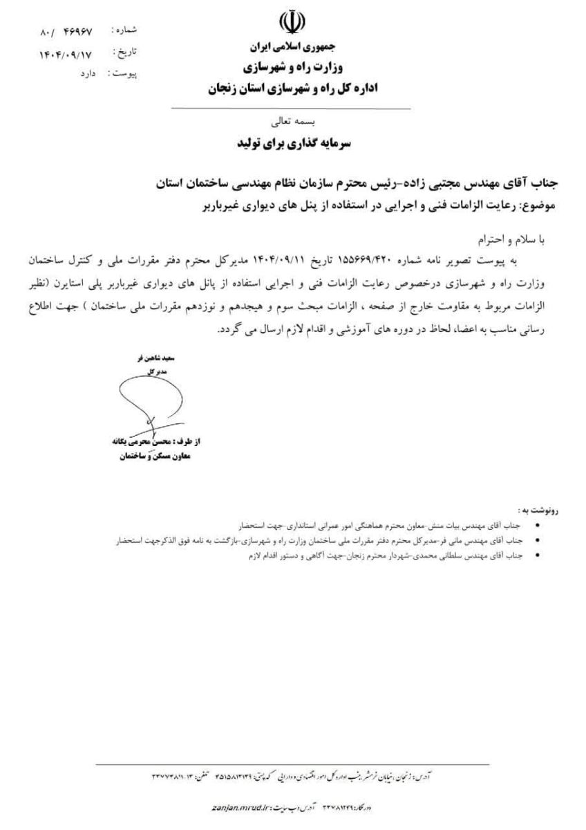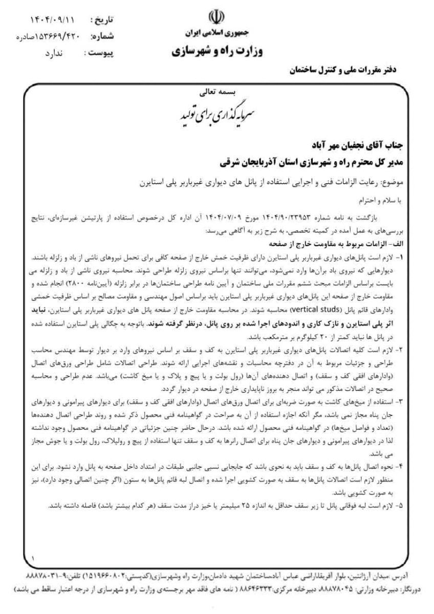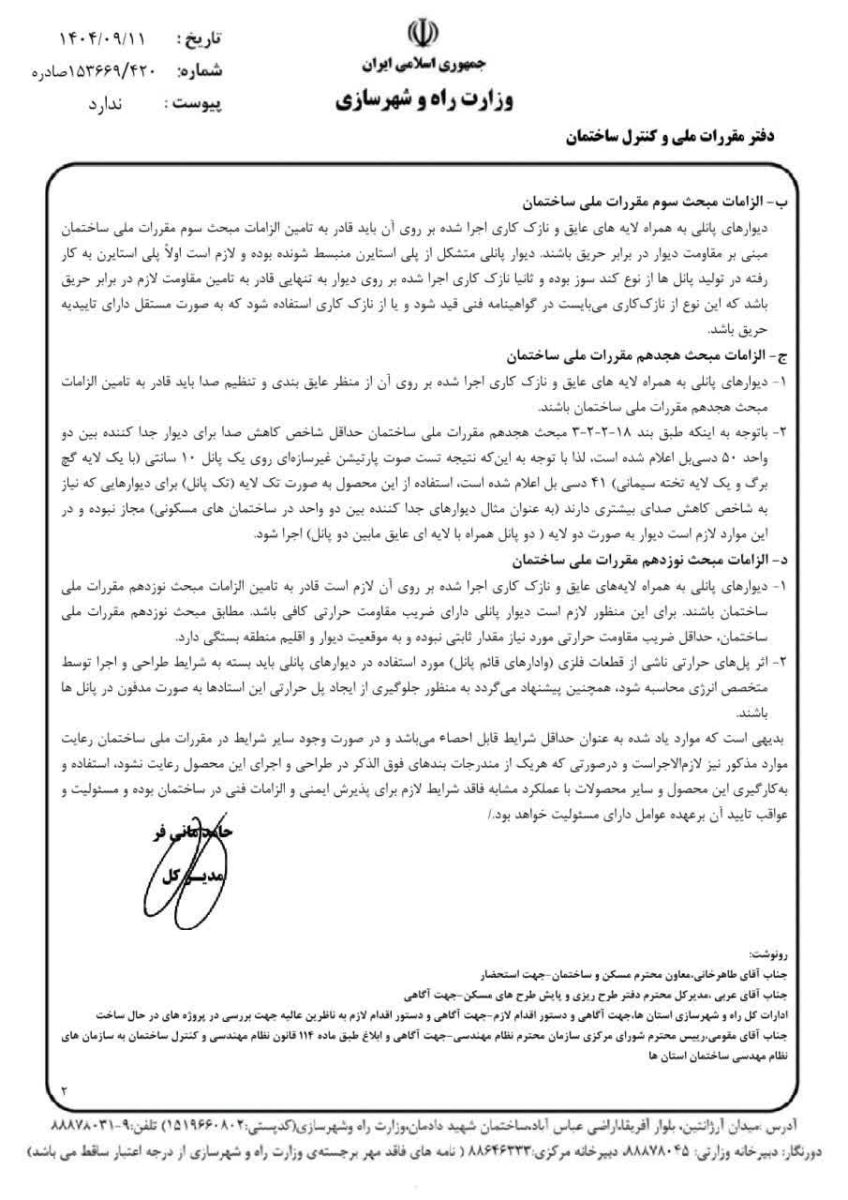 ✴️رعایت الزامات فنی و اجرایی در استفاده از پنل های دیواری غیر باربر ☀️مکاتبه مدیر کل دفتر مقررات ملی و کنترل ساختمان وزارت راه و شهرسازی ر خصوص رعایت الزامات فنی و اجرایی استفاده از پنلهای دیواری غیر باربر پلی اسیتایرن (نظیر الزامات مربوط به مقاومت خارج از صفحه، الزامات مبحث سوم و هجدهم و نوزدهم مقررات ملی ساختمان)