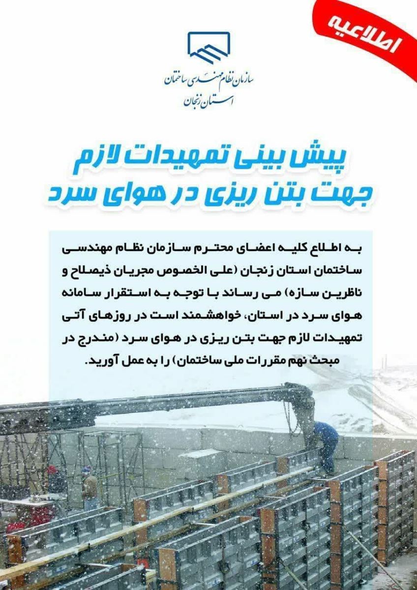 🔷️حصول اطمینان از ایستایی مصالح و استحکام داربست ها و پیش بینی تمهیدات لازم جهت بتن ریزی در هوای سرد 💠به اطلاع کلیه اعضای محترم سازمان نظام مهندسی ساختمان استان زنجان (علی الخصوص مجریان ذیصلاح و ناظرین سازه) می رساند با توجه به هشدار سازمان هواشناسی در خصوص وزش باد شدید و ورود سامانه هوای سرد به استان، خواهشمند است در روزهای آتی ضمن اطمینان از ایستایی مصالح و استحکام داربست ها، تمهیدات لازم جهت بتن ریزی در هوای سرد (مندرج در مبحث نهم مقررات ملی ساختمان) را به عمل آورید.