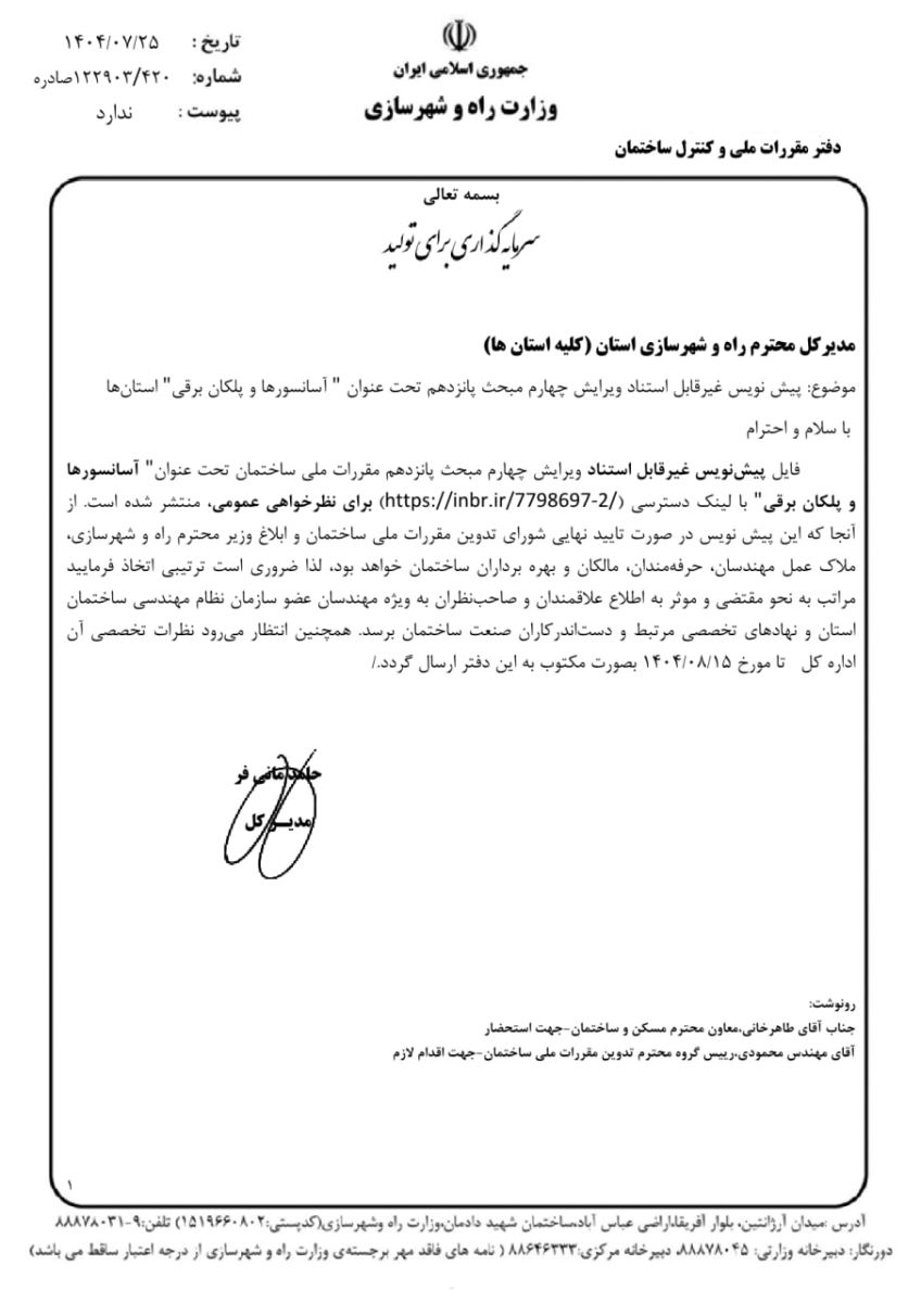 🔹️از کلیه اساتید، مهندسان، متخصصان و دست اندرکاران صنعت ساختمان درخواست میشود نظرات و پیشنهادات خود را در خصوص این پیشنویس حداکثر تا تاریخ 15-08-1404 ، به نشانی الکترونیکی mabhas@inbr.ir ارسال نمایند.