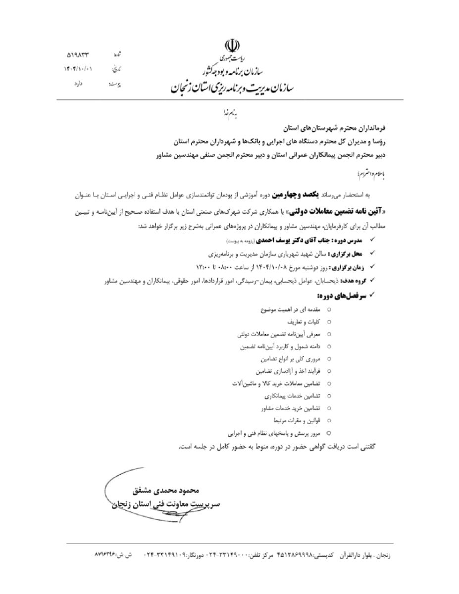 🔆دوره آموزشی آیین نامه تضمین معاملات دولتی 🔅 صد و چهارمین دوره آموزشی از پودمان توانمندسازی عوامل نظام فنی و اجرایی استان با عنوان آیین نامه تضمین معاملات دولتی، با همکاری شرکت شهرکهای صنعتی استان با هدف استفاده صحیح از آیین نامه و تبیین مطالب آن برای کارفرمایان، مهندسان مشاور و پیمانکاران در پروژههای عمرانی برگزار میگردد.