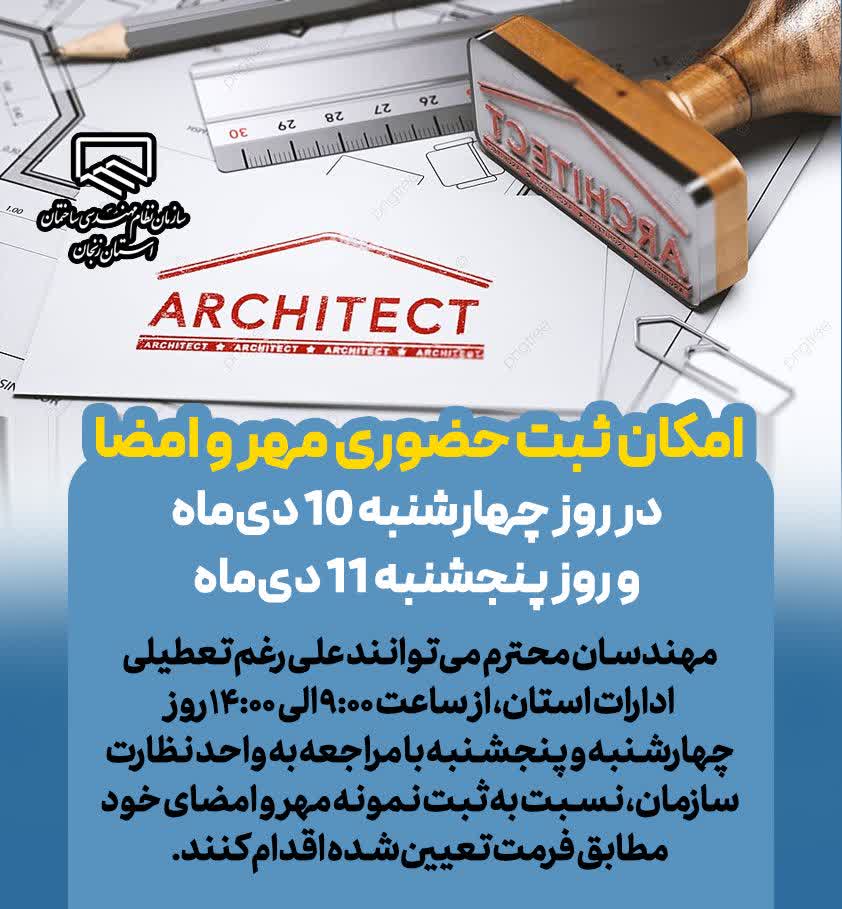 🔹️مهندسان محترم میتوانند طی روزهای چهارشنبه و پنجشنبه هفته جاری، از ساعت ۹:۰۰ الی ۱۴:۰۰ با مراجعه به واحد نظارت سازمان (نزد سرکار خانم مهندس رسایی)، نسبت به ثبت نمونه مهر و امضای خود مطابق فرمت تعیینشده اقدام نمایند.
