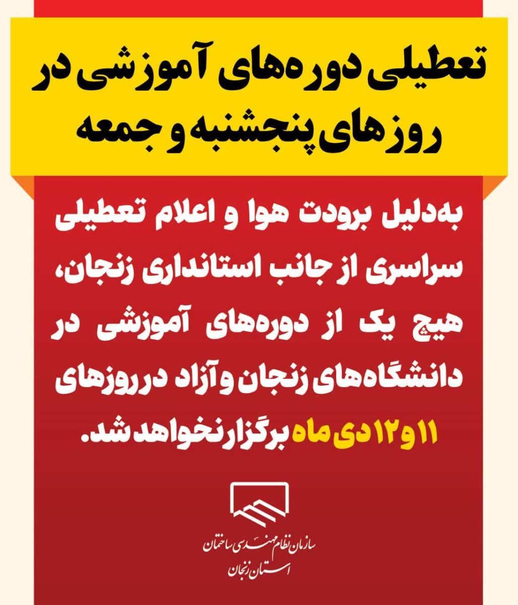 ⭕️تعطیلی دورههای آموزشی در روزهای پنجشنبه و جمعه ⭕️بهدلیل برودت هوا و اعلام تعطیلی سراسری از جانب استانداری زنجان، هیچ یک از دورههای آموزشی در دانشگاههای زنجان و آزاد در روزهای ۱۱ و ۱۲ دی ماه برگزار نخواهد شد